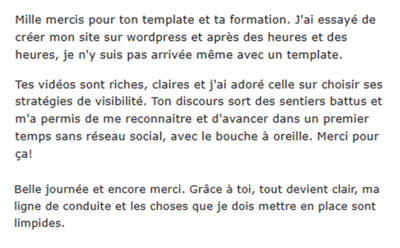 Le template est super bien conçu ce qui facilite ensuite la personnalisation. Et on peut facilement revenir sur une vidéo tuto quand c'est nécessaire ou contacter Zoé par mail si on bloque sur un point. Avant le lancement de mon site, j'ai sollicité Zoé pour un audit et là encore, j'ai eu un retour hyper pro. Une vidéo détaillée sur tous les points importants du site, des conseils d'amélioration et les explications pour les réaliser.