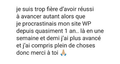 Non seulement, je suis très contente du résultat, mais en plus j'ai beaucoup appris. Et j'aime particulièrement le fait d'être à présent complètement autonome pour faire des changements sur mon site.